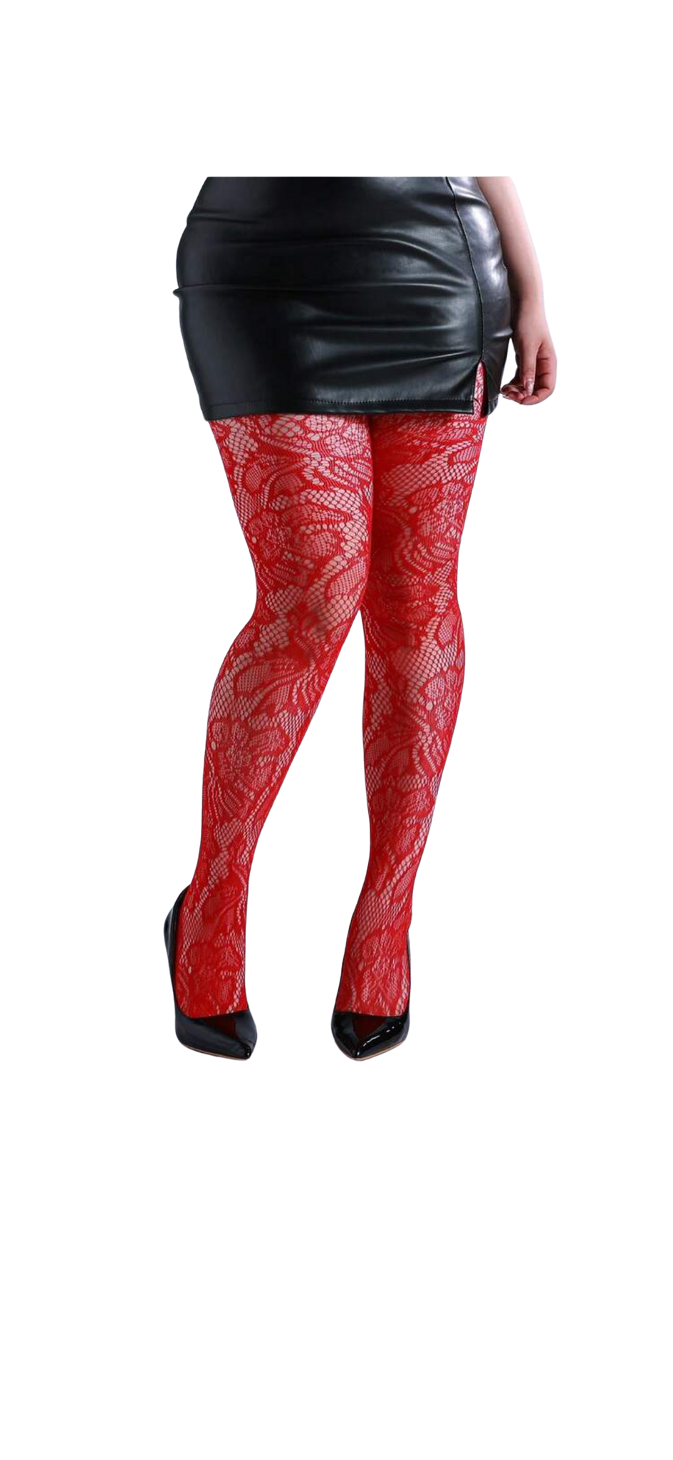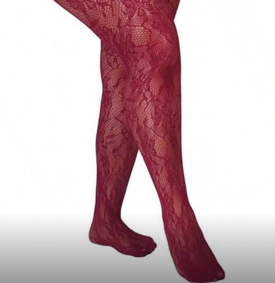 Burgundy floral fishnet tights.