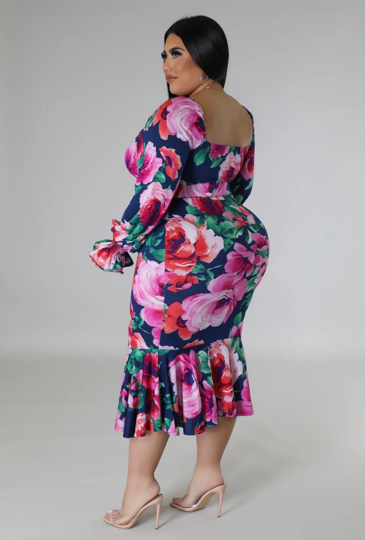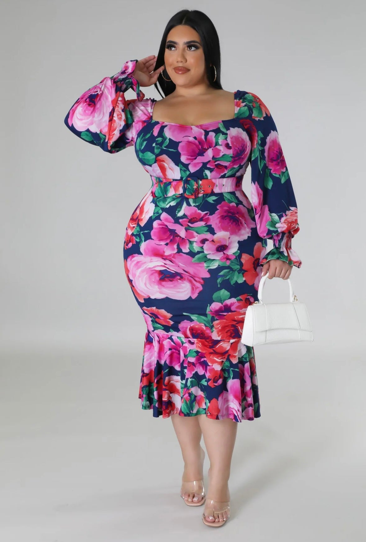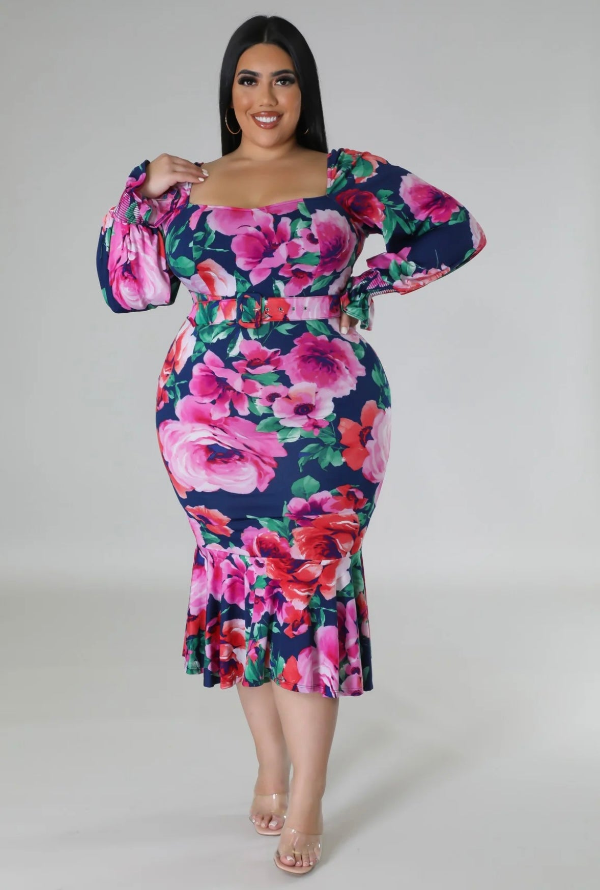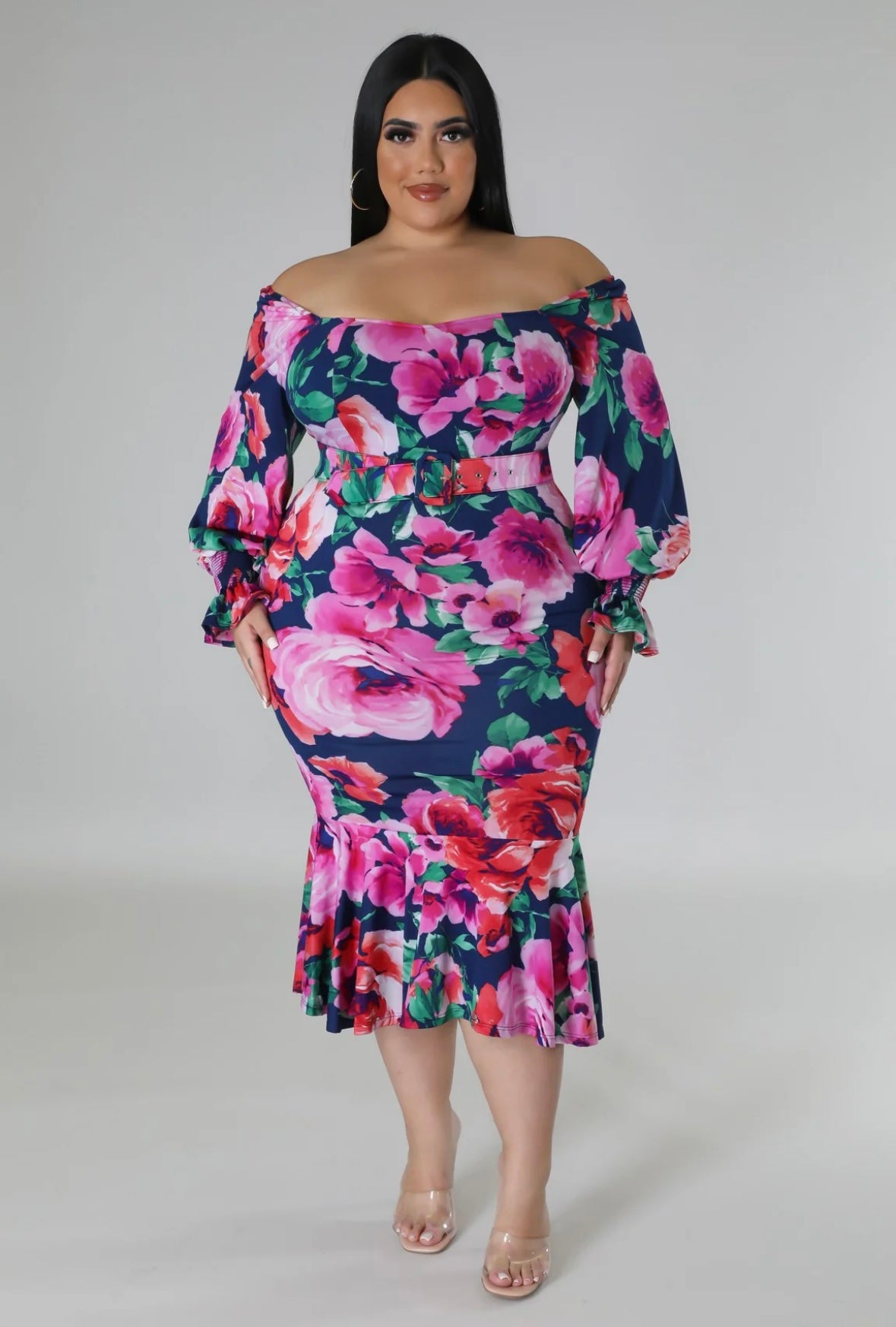 Floral print body con style trumpet hem dress with matching belt. Can be worn on or off shoulders.